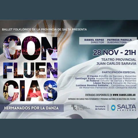 El 28 de noviembre, a las 21:00, el Teatro Provincial “Juan Carlos Saravia” será escenario de Confluencias, una gala de danza folklórica que reúne al Ballet Folklórico de Salta con academias de distintos puntos del territorio provincial. La propuesta celebra el Mes de la Tradición y destaca el trabajo de los cuerpos de danza que representan a Salta en certámenes y festivales nacionales.