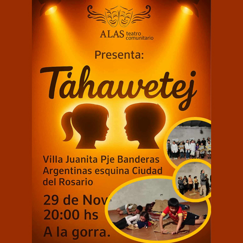 El elenco es el de ALAS, TEATRO COMUNITARIO, dirigido por Cristian Rodrigo Villarreal, que pone en escena la obra Táhawetej, una creación colectiva de los vecinos de Villa Juanita, en el marco de la Semana Nacional de Teatro Comunitario. La obra es un canto de voces, sin quejas, sin arengas, para un mundo posible.